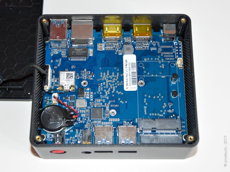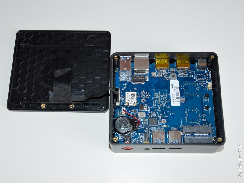 Der Mini PC lässt sich am Boden öffnen. Man kann auf der Bodenplatte eine 2,5 Zoll SSD nachrüsten oder andere Speicherbausteine.